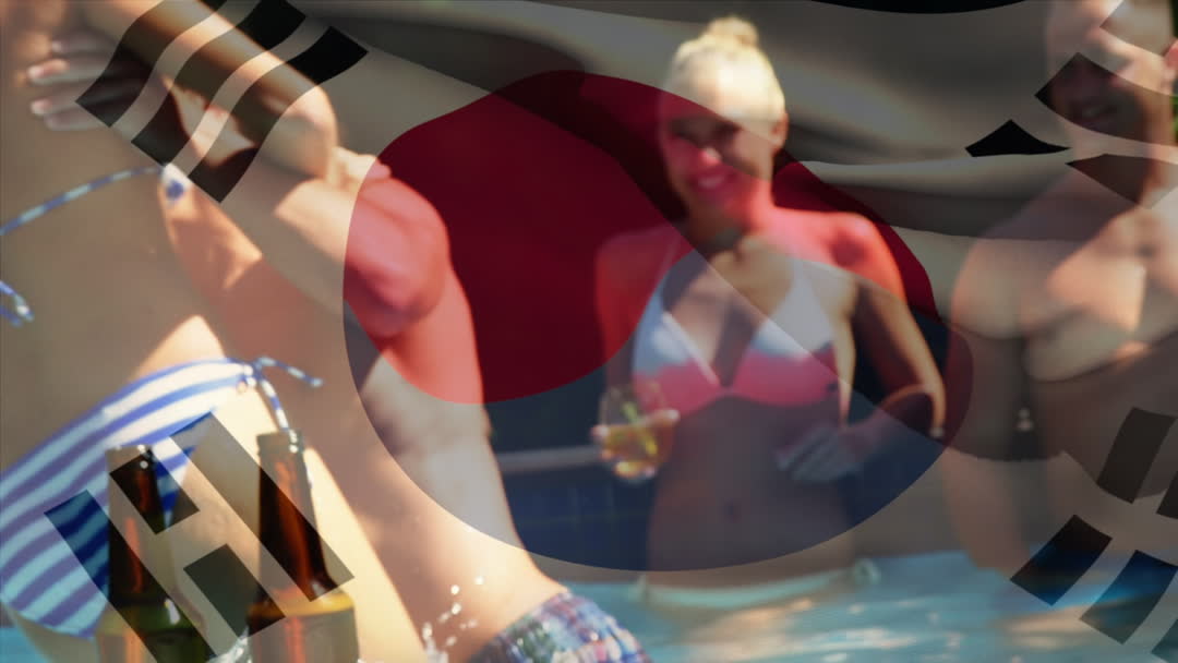 Multicultural Celebration at Summer Pool Party with South Korean Flag Overlay Video