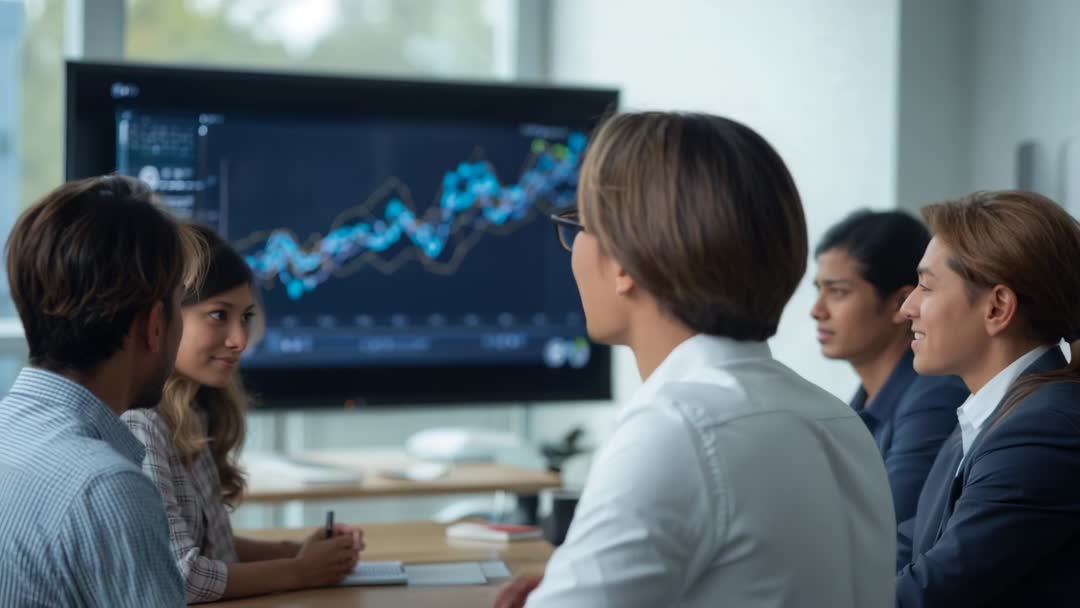 AI Generated Video. Video showing multicultural business team gathered around conference table, leader in white shirt and glasses presenting dynamic market charts on large digital display. Participants listening, taking notes, and engaging in discussion, conveying collaboration, strategy planning, and data-driven decision making. Perfect for illustrating market analysis, analytics, finance reporting, leadership, and teamwork themes. Suitable for corporate website banners, investor pitch decks, training modules, consulting presentations, marketing campaigns, and social media storytelling. Clip working well for editorial content, business blogs, investor relations materials, and internal communication programs.
