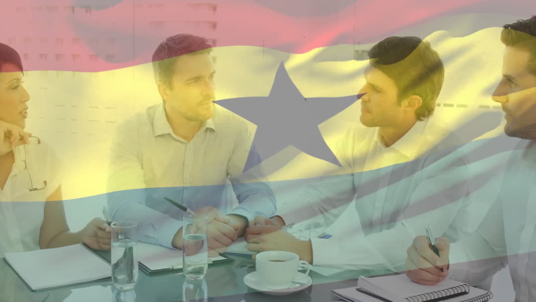 Group of business professionals engaging in a collaborative discussion with Ghana flag overlay symbolizes unity and diverse collaboration in international contexts. Suitable for materials discussing global business strategies, corporate diversity inclusion efforts, and multicultural professional environments.