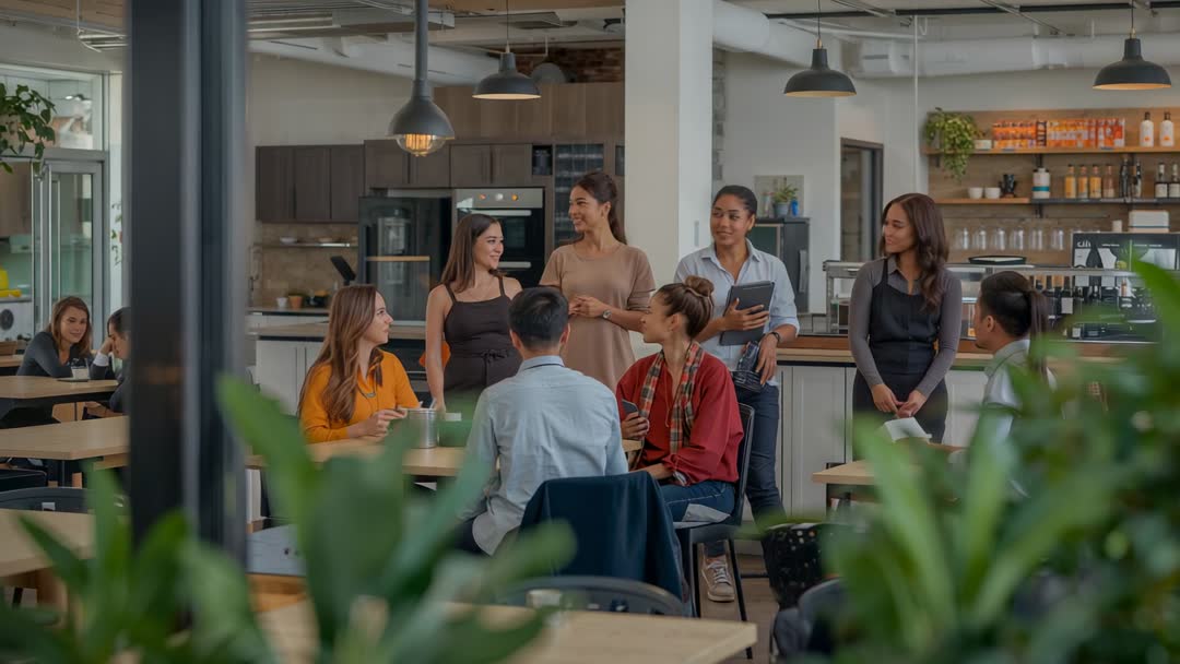 AI Generated Image. Video showing multicultural team gathering in open office cafe, woman holding tablet presenting quick update while colleagues are nodding and laughing. Scene featuring casual workwear, kitchen background, coffee cups, and natural light for authentic workplace vibe. Footage working well for corporate communications, team culture videos, internal announcements, training modules, marketing for coworking spaces, and startup branding. Use for website hero, social media posts, presentation slides, recruitment campaigns, or blog articles about collaboration, remote work, or modern office design. Clips allowing editors to cut into longer sequences or use as short vignette for storytelling.