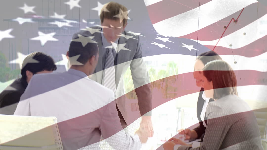 The video depicts a diverse team of business professionals engaged in discussion, with a U.S. Flag overlay. Suitable for themes related to teamwork, multicultural collaboration, and patriotism in a business context. Useful for publications on international business relations and diversity in American workplaces.
