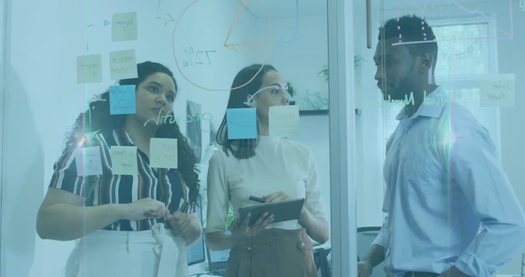 Three multiracial coworkers engaged in a collaborative brainstorming session. They are using sticky notes on a wall to organize their business ideas, possibly working on project planning or developing a new strategy. This video conveys themes of creativity, teamwork, and a diverse work environment, making it ideal for publications or presentations on collaborative workspaces, innovative team strategies, and effective communication techniques.