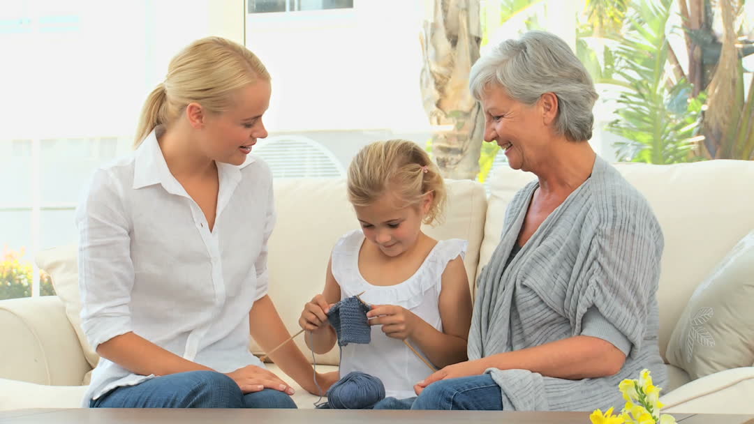 Girl learning how to knit with her mother and grandmother, sitting on the sofa. Emphasizes family bonding and passing down skills through generations. Useful for advertisements related to family values, crafting workshops, or home life promotions.