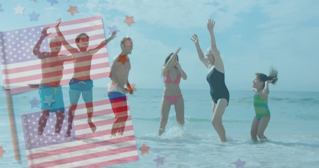 Multigenerational Family Celebrating Unity at Beach with Flag Overlay Video