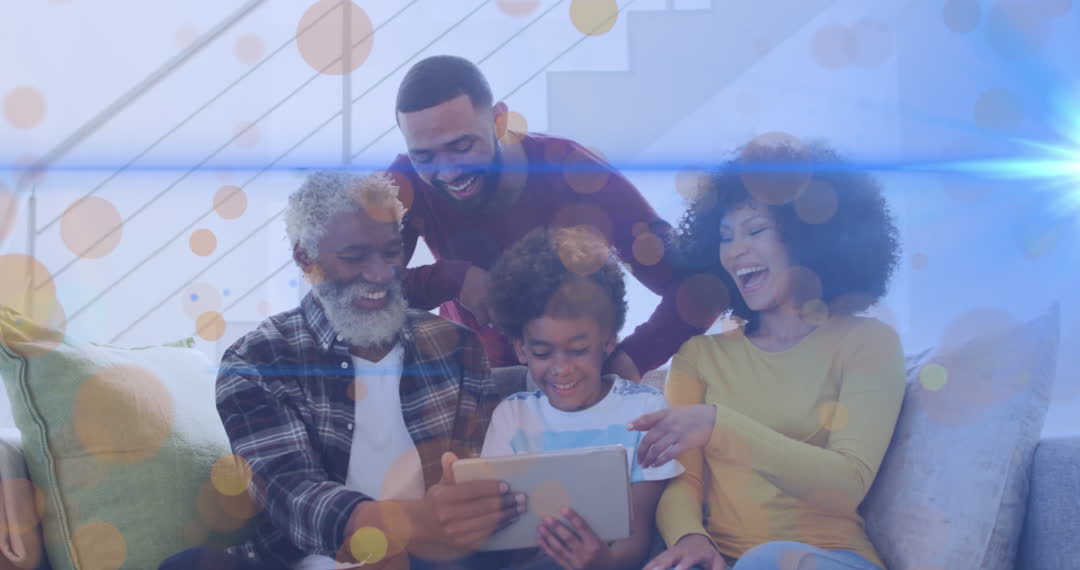 This video captures a joyful moment where a multigenerational African American family is enjoying time together at home using a tablet. The cheerful expressions highlight family bonding and sharing technology for entertainment or learning. This can be used in marketing materials related to family tech products, home living or millennial parenting articles.