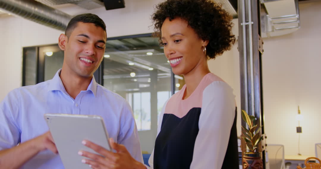 Two multiracial colleagues collaborating in a modern office environment. They are engaged with a tablet, likely discussing a project or presenting ideas. They appear in business casual attire. This is suitable for advertisements on diversity and collaboration in corporate settings, or editorial content related to teamwork and modern workplace technology.