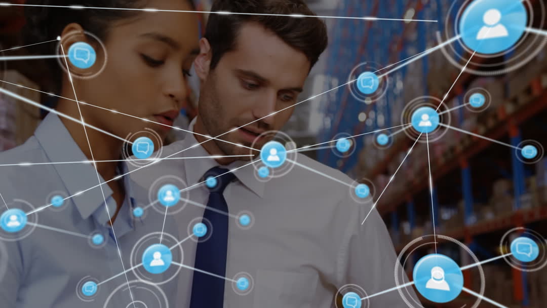 Colleagues stand in a warehouse, surrounded by digital graphics of interconnected profile icons symbolizing networking and data sharing. This composition can be used to illustrate themes such as global business collaboration, digital connectivity, logistics innovation, or corporate communication in technology and supply chain industries.
