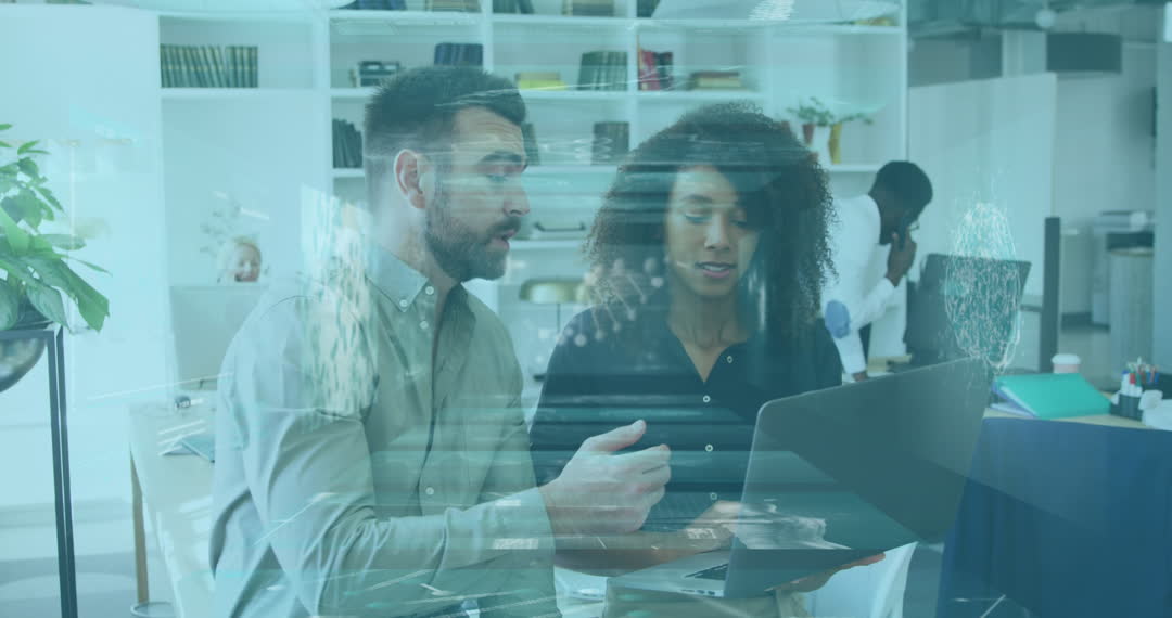 Multiracial coworkers focus on laptop with digital infographic related to DNA study, blending science and technology themes. Useful for illustrating innovative alliance merging healthcare and tech fields, fostering collaboration and communication dynamics within a modern office.