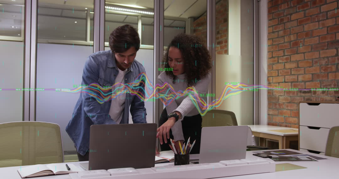 Multiracial coworkers collaborate in a modern office space, analyzing business reports on laptops with overlay of colorful digital graphs. This visual emphasizes technology-driven collaboration and effective teamwork in a corporate environment, suitable for illustrating business growth, strategic planning, or presentations focused on data analysis and communication.