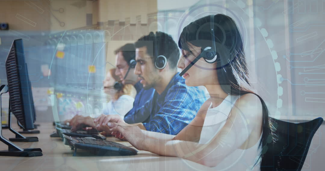 Call center team working at desks with headsets, grouped in a modern office environment. Transparent digital effects imply data processing and global communication, reflecting technological progress and connectivity. Ideal for visual storytelling about global business, data analytics, evolving customer service, and diverse work environments. Useful for illustrating themes related to modern technology in customer interaction and corporate professionalism.