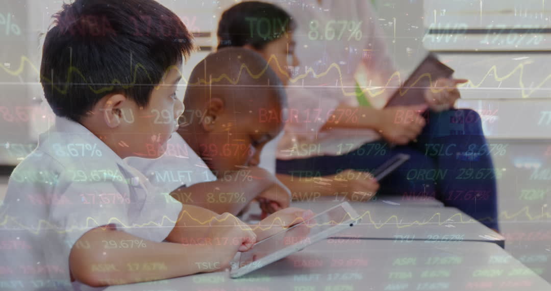 This video, combining students using digital tablets in a classroom with a stock market data overlay, represents the blend of modern education and financial literacy. It's useful for concepts around e-learning, integrating technology into education, or introducing financial markets to younger audiences. Suitable for educational websites, investment guides for parents, and tech-savvy education initiatives.