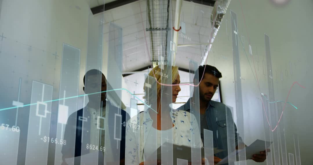 Image depicts a diverse group of colleagues studying financial data, blended with animated charts and graphs. Ideal for illustrating modern business processes, teamwork in finance, or corporate innovation. Useful for presentations, blogs, and articles on finance, collaboration, or data-driven decision making.