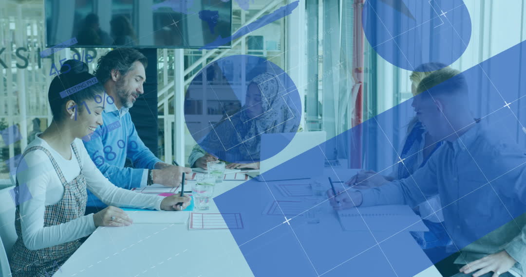 - Multiracial Team Brainstorming with Digital Interface Overlay