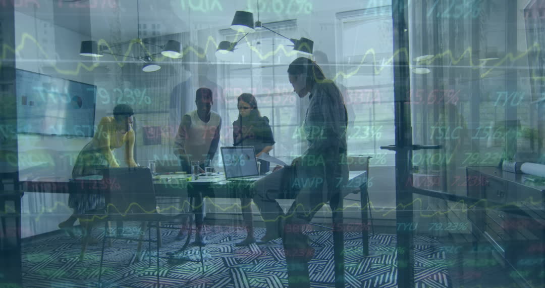 Workers in modern office analyze financial market reports with digital stock data projected over their meeting, representing business strategy and teamwork. Useful for illustrating innovation in financial consulting, investment companies, and corporate team dynamics.