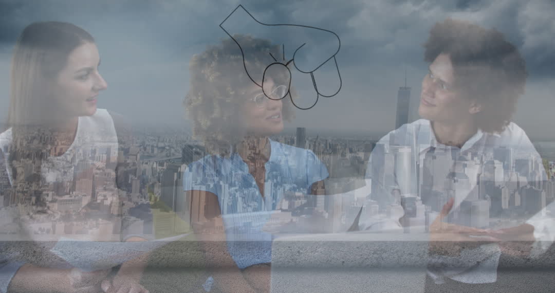Multiracial Team Collaboration with Urban Skyline Overlay Video