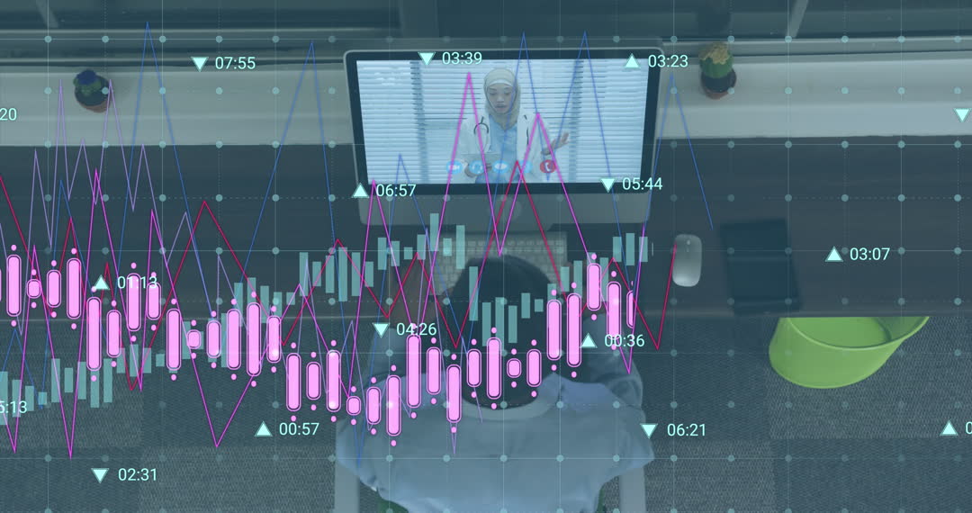 Image captures futuristic concept of a professional engaged in a video meeting with a female doctor, overlaid with dynamic digital graph analytics. Ideal for use in articles or materials focusing on telemedicine, remote work culture, innovations in virtual communication, and digital data management solutions.