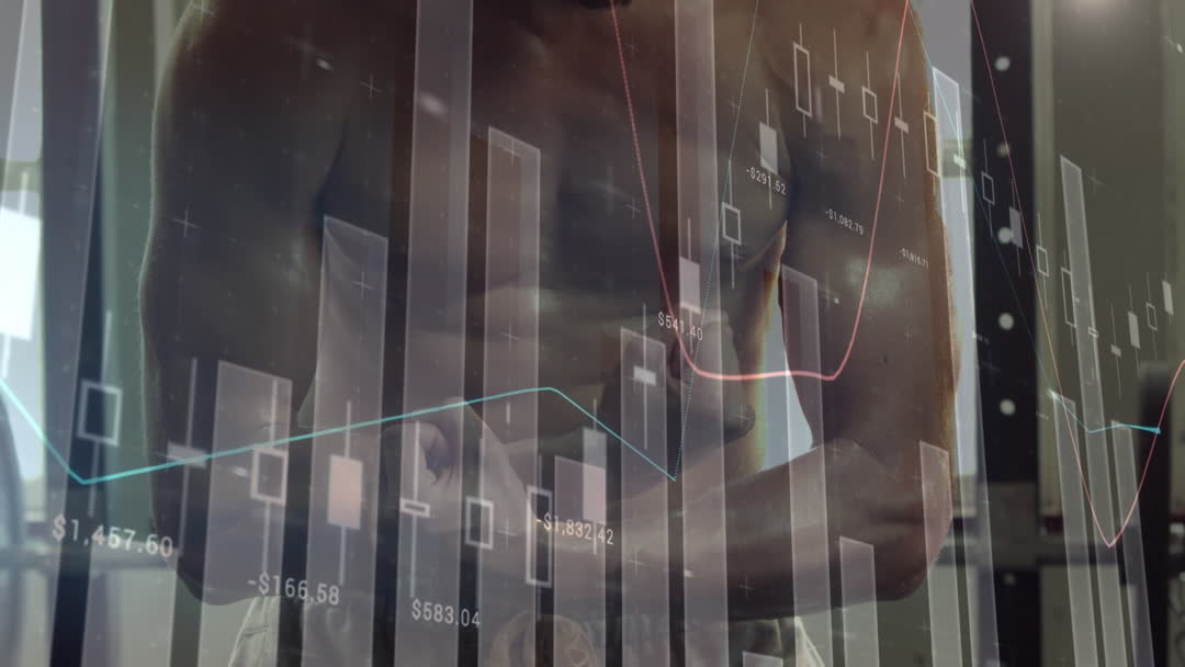 The muscular torso of an athlete is overlaid with transparent financial graphs, combining themes of physical fitness and financial analysis. The blend of digital analytics with workout intensity symbolizes the fusion of two dynamic sectors. This visual is applicable for illustrating concepts related to health, performance tracking, business strategy in sports, and the metaphorical synergy linking financial strength with physical prowess.