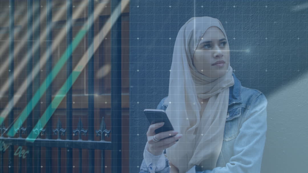 Incorporating a virtual grid overlay with a focus on a Muslim woman using a smartphone, this video combines modern technology and connectivity themes. Ideal for illustrating concepts related to digital communication, financial data processing, and telecommunications in an urban context. Useful for websites, blogs, and presentations centered around technology, finance, and cultural diversity.
