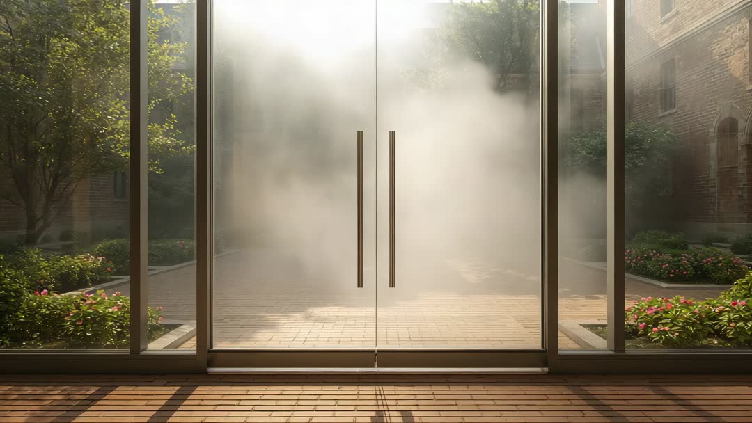 AI Generated Image. Video reveals gentle fog seeping through glass doors into tranquil brick courtyard, obliterating paths and creating mysterious atmosphere. Suggesting concept of ambiguity and bridging outside nature to indoor serenity. Ideal for promoting peaceful retreats, garden spaces or atmospheric architectural designs.