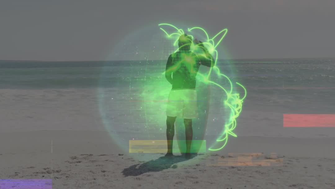 A man stands on a serene beach with a digital glowing aura surrounding him, creating an enigmatic and futuristic feel. Useful for concepts related to digital connections, spirituality, or sci-fi design projects. This striking piece of art evokes curiosity about the power of connection in a technological world.