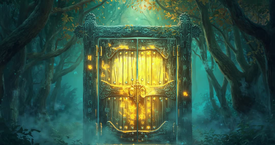 - Mysterious Glowing Gate in Enchanted Forest Clearing