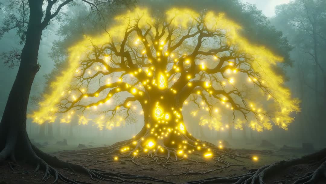 - Mysterious Glowing Tree in Misty Forest Enchants with Golden Orbs