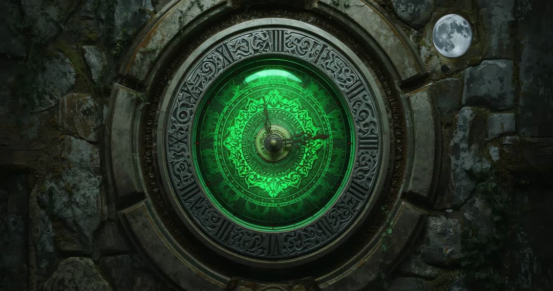 AI Generated Image. This mesmerizing scene features a captivating ancient mechanism glowing under a mystical emerald light. The intricate design with a detailed brass pointer operates quietly in a moss-laden stone chamber, reminiscent of a steampunk or alchemical artifact. Ideal for use in media related to fantasy storytelling, magical worlds, or historical exploration themes. Perfect for illustration on crafting intricate machinery or setting a scene within mystical or ambient content.