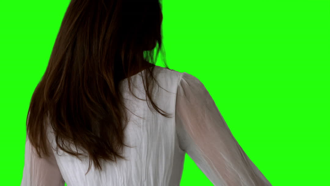 Woman with long hair wears a flowing white dress, turning away from the camera against vibrant green screen. Useful for creative background applications, visual effect projects or fashion design concepts, adding versatility and destructional elements to diverse videory contexts.
