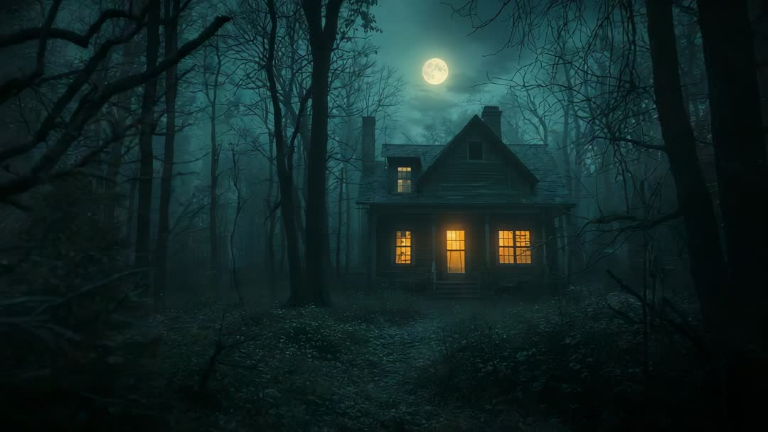 - Mysterious Wooden Cabin in Moonlit Misty Forest