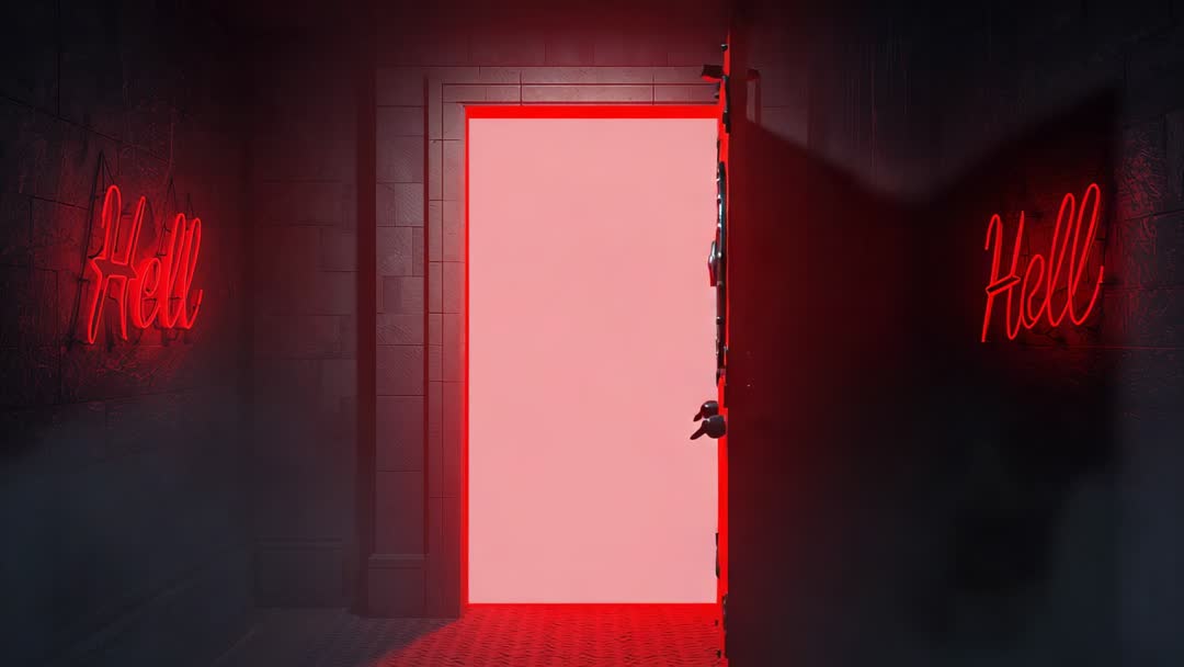 AI Generated Image. Glowing red door pivots in a dim hallway, illuminated by smoke and eerie red neon 'Hell' signs on the walls. This atmospheric and ominous scene evokes suspense and mystery, making it ideal for illustrating concepts of intrigue, danger, the supernatural, or entry to unknown dimensions. Perfect for use in mysterious or gothic media presentations, fantasy book covers, or creative graphic design projects.