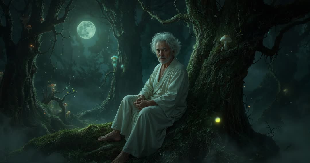 AI Generated Image. The video captures an elderly man in a serene forest, elegantly draped in a white robe, peacefully interacting with glimmering orbs floating around him under soft moonlight. The woodland is enriched with the presence of majestic glowing mushrooms and flickering fireflies, enhancing the mystical allure. This enchanting video is ideal for fantasy projects, storytelling, book covers, or elements in game design, richly conveying calmness and an ambiance of magic combined with nature's beauty.
