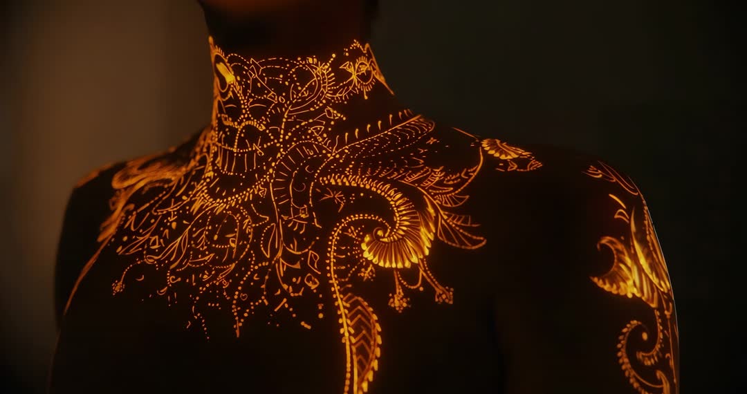 - Mystical Golden Patterns Illuminating Female Torso in Artistic Display