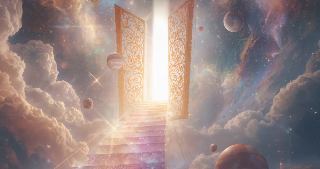 AI Generated Image. Golden doors swing open atop a gleaming staircase within an expansive nebula, surrounded by swirling planets and cosmic hues. This dreamy and ethereal video perfectly captures the essence of fantasy and surrealism. It is ideal for use in digital art collections, sci-fi or fantasy multimedia projects, spiritual and metaphysical realms, and futuristic concept presentations.