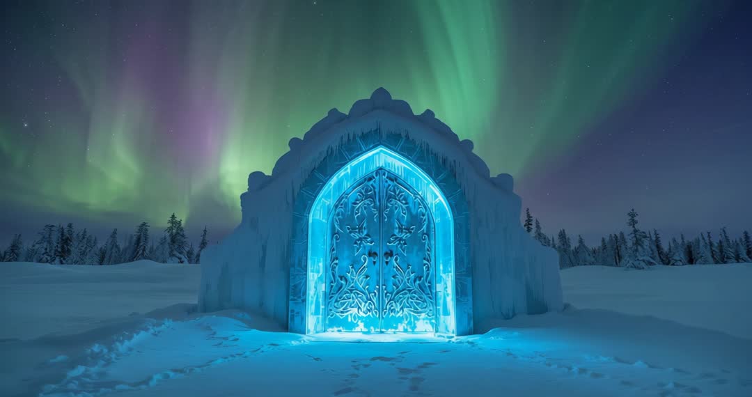 - Mystical Ice Gateway Beneath Shimmering Northern Lights Fantasy