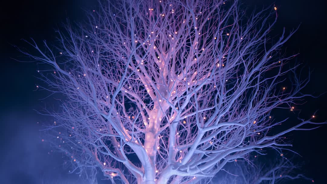 AI Generated Image. The video captures a mesmerizing leafless tree adorned with ember-like lights flickering gently against a backdrop of darkness and mist. This scene creates a serene and mystical atmosphere, evoking feelings of tranquility and magic. Ideal for use in projects related to fantasy themes, environmental settings, or calming and ethereal experiences. Perfect for adding a touch of wonder to visual storytelling or creative backdrops for relaxation content.
