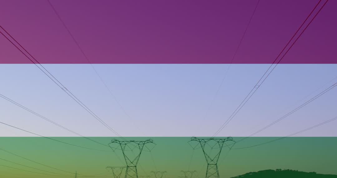 Pylons adorned with an overlay of a national flag. Symbolizes energy resources and geopolitical tensions. Useful for articles or media related to national identity, energy exploration, geopolitical crises, and discussions on international politics.