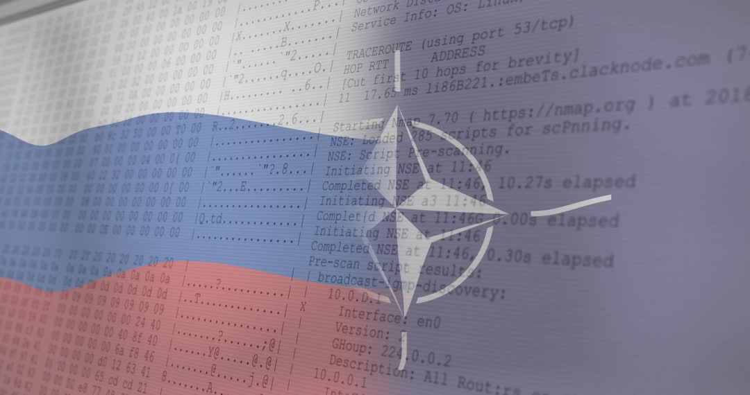 This digital composition features NATO's emblem overlaid on a computer screen showing network scan data and text in the colors of the Russian flag. It symbolizes themes related to geopolitics, digital security, and cybersecurity issues. Ideal for use in articles, presentations, and publications about cybersecurity threats, international relations, technology advancements, and security paradigms.