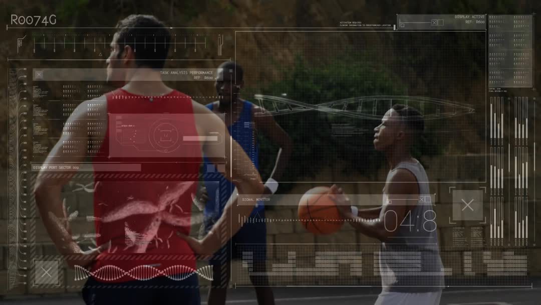 Showing three players on outdoor neighborhood court, shooter rising to take three-point shot while HUD overlay tracking ball arc, release angle, and shot timing. Overlay presenting waveform, data bars, countdown timer, and trajectory line, creating high-tech sports analytics atmosphere. Ideal for sports technology promotion, coaching tutorials, performance analytics demonstrations, broadcast lower-thirds, and social media clips highlighting player development and shot mechanics. Working well for mobile app demos, training platforms, sportswear advertising, broadcast openers, and urban community sports storytelling. Clean HUD elements and daylight footage making scene ready for integration into editing timelines and motion graphics packages.