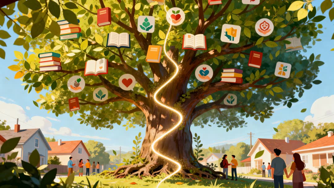 AI Generated Video. Video presenting neighborhood gathering under giant tree with books and icons growing from branches, golden spiral of light climbing trunk marking International Volunteer Day. Scene showing neighbors of all ages meeting outdoors, sharing books, swapping ideas, connecting over community projects. Visual style delivering warm sunlight, leafy canopy, inviting suburban street backdrop. Serving nonprofit campaigns promoting volunteerism, community outreach, event promotion, social media marketing, educational programs, library initiatives, civic engagement stories, fundraising pages, seasonal volunteer drives. Licensing fitting marketing, editorial storytelling, presentation headers, website hero banners, animated campaign intros, digital ads, and classroom resources.