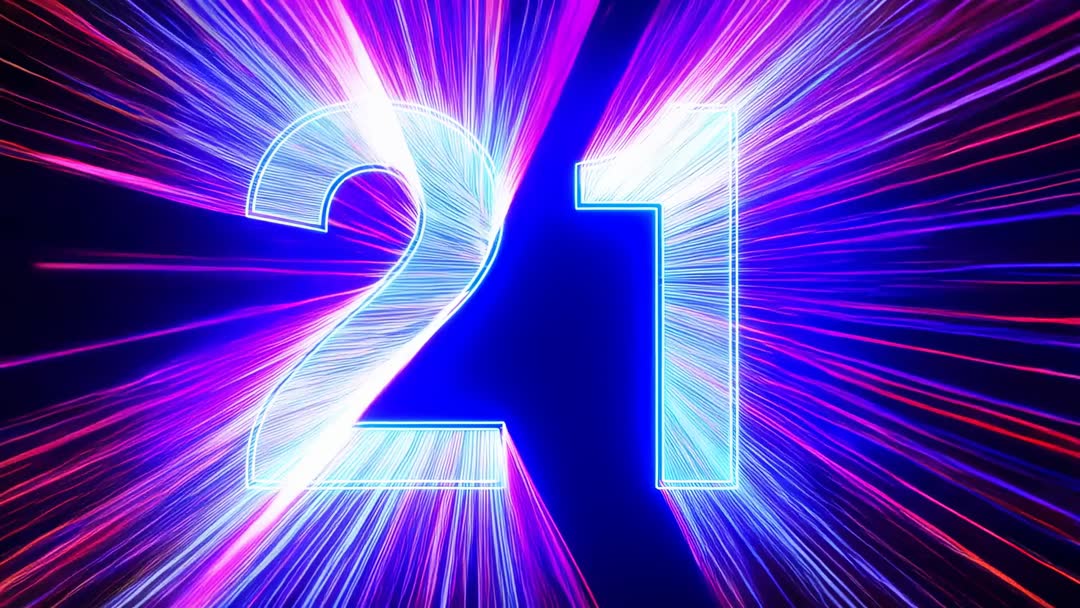 AI Generated Image. Showing neon-outlined numeral 21 with pulsating cyan core and magenta radial streaks bursting outward against deep black backdrop. Creating dynamic, high-energy clip ideal for countdown sequences, event openers, and social media intros. Serving as loopable visual for party promos, New Year countdowns, birthday and anniversary announcements, club visuals, and music video transitions. Allowing easy overlay of text or logo in center negative space for branding and title cards. Offering bright, contrasting color palette for bold thumbnails and hero screens; suggesting pairing with synthwave or electronic audio for full impact. Providing clean composition for color grading, speed ramping, and integration into multi-layer motion projects.
