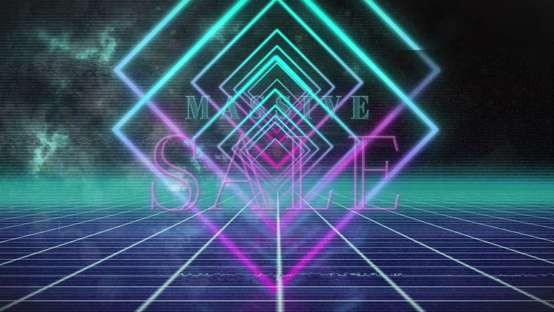 Colorful neon animation features retro geometric shapes framing massive sale text, adding dynamic energy fitting for promotional material. Suitable for digital marketing campaigns, social media ads, or website headers focusing on sale events.