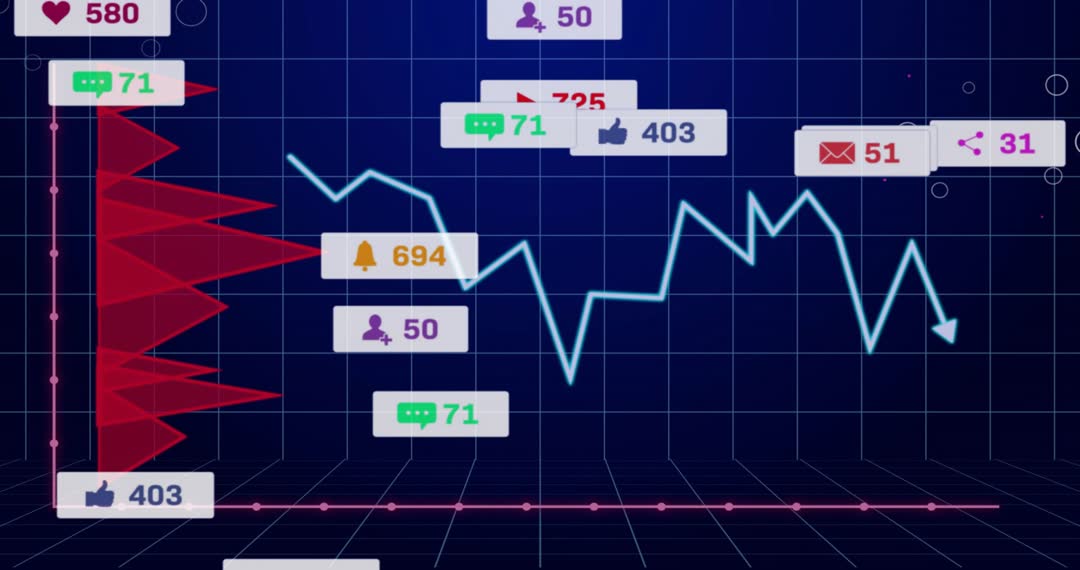 Showing neon analytics dashboard with cyan line trace moving right across 3D grid while floating badges updating to display likes, comments, followers, messages, notifications. Visualizing social media engagement and real-time performance metrics with holographic UI elements and pulsing highlights. Featuring red volume histogram on vertical axis, pink timeline markers, and dynamic pop-up counters for quick metric recognition. Serving as intro clip for analytics platform, background visual for dashboard walkthrough, overlay for social campaign report, or visual element for product launch and investor pitch. Allowing brand color customization, text overlay, and timed edits for use in marketing videos, explainer content, UI demos, and tech presentations.