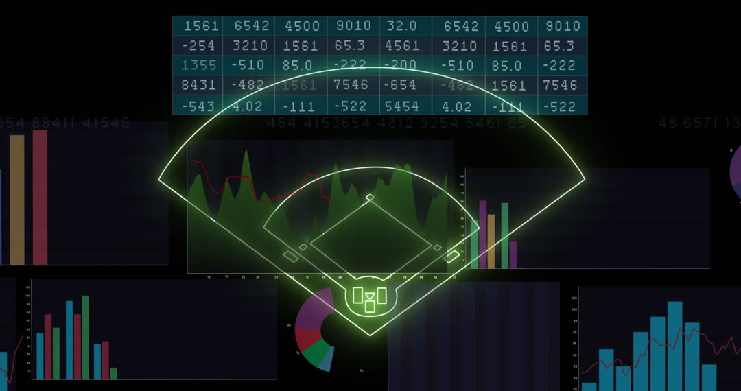 This digital animation depicts a neon outline of a baseball stadium hovering over diverse data visualizations against a dark background. The mix of bar charts, line graphs, and numeric data reflects sports analytics and technology. Ideal for use in sports technology presentations, articles on data-driven gaming strategies, or innovative digital sports solutions. Useful also for depicting futuristic sports analysis concepts or media covering advancements in sports data capture and processing.