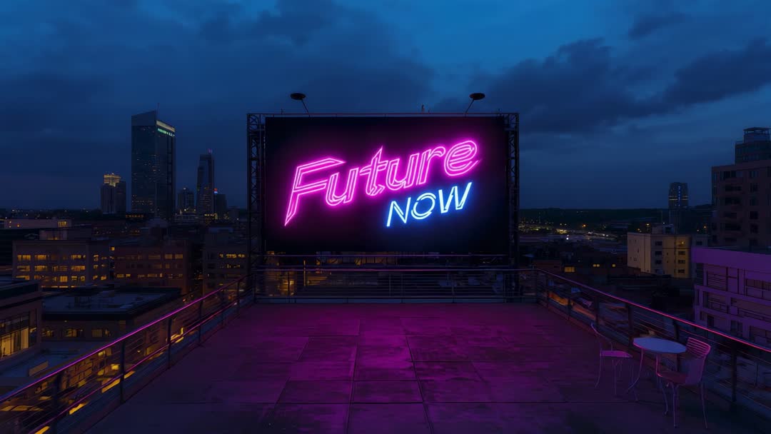 - Neon billboard 'Future NOW' glowing on rooftop terrace at dusk casting magenta city glow