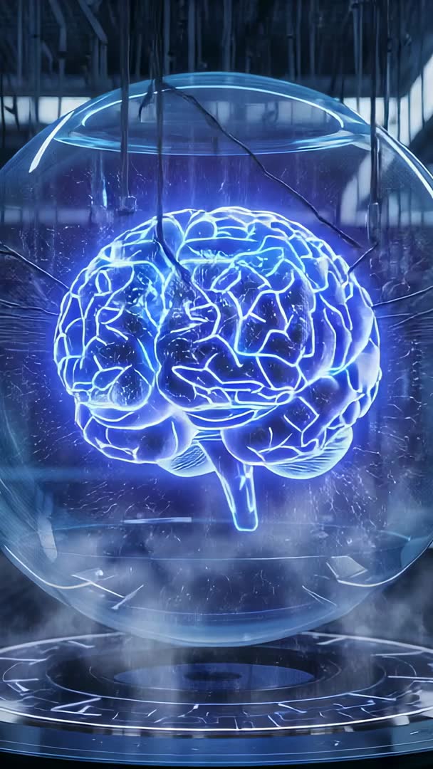 AI Generated Image. Vertical video showing neon blue brain model powering up and rotating inside transparent spherical chamber while cables connect to neural interface. Glowing neural pathways and electric arcs emphasizing data flow and energy transfer. Background featuring lab equipment and fog creating cinematic, high-tech atmosphere for science and technology themes. Usage ideas: suitable for AI presentations, neuroscience research promos, medical technology demos, sci-fi trailers, startup pitch decks, app hero backgrounds, social media vertical ads, and digital product launches. Format optimized for vertical 9:16 and mobile-first platforms including Instagram Stories, TikTok, and Reels. Post-production suggestions: apply color grading to match brand palette, create slow-motion loop for seamless background, add text overlay or lower-third for messaging, and combine with ambient electronic soundtrack for immersive effect.
