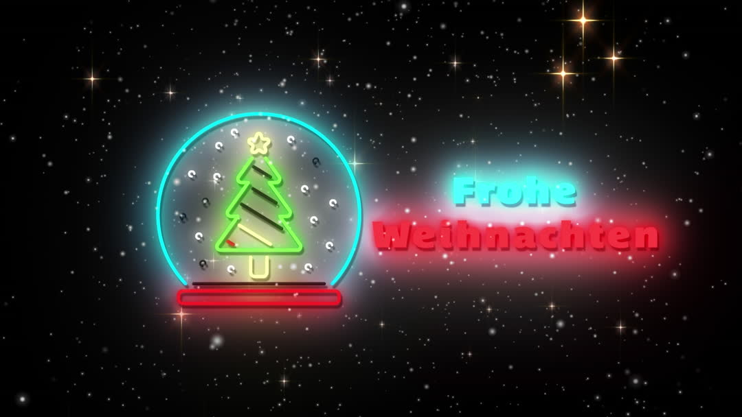 This illustration features a neon Christmas globe with swirling snowflakes and colorful 'Frohe Weihnachten' text alongside, set against a starlit dark background. Ideal for holiday greeting cards, Christmas-themed advertisements, multilingual festive display content, or digital winter marketing campaigns.