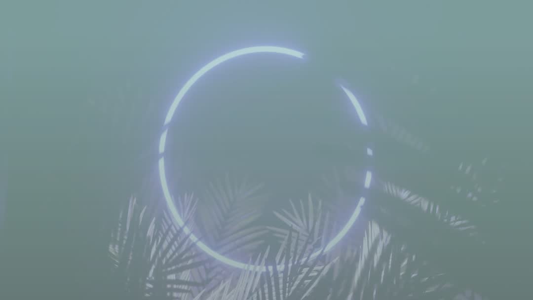 This captivating scene features pulsating neon lights forming a circle surrounded by silhouetted palm fronds emerging through gradient shifting. Its unique, abstract fusion of futuristic design and a tropical backdrop makes it ideal for creative projects, video backdrops, digital art displays, and promotional visuals.