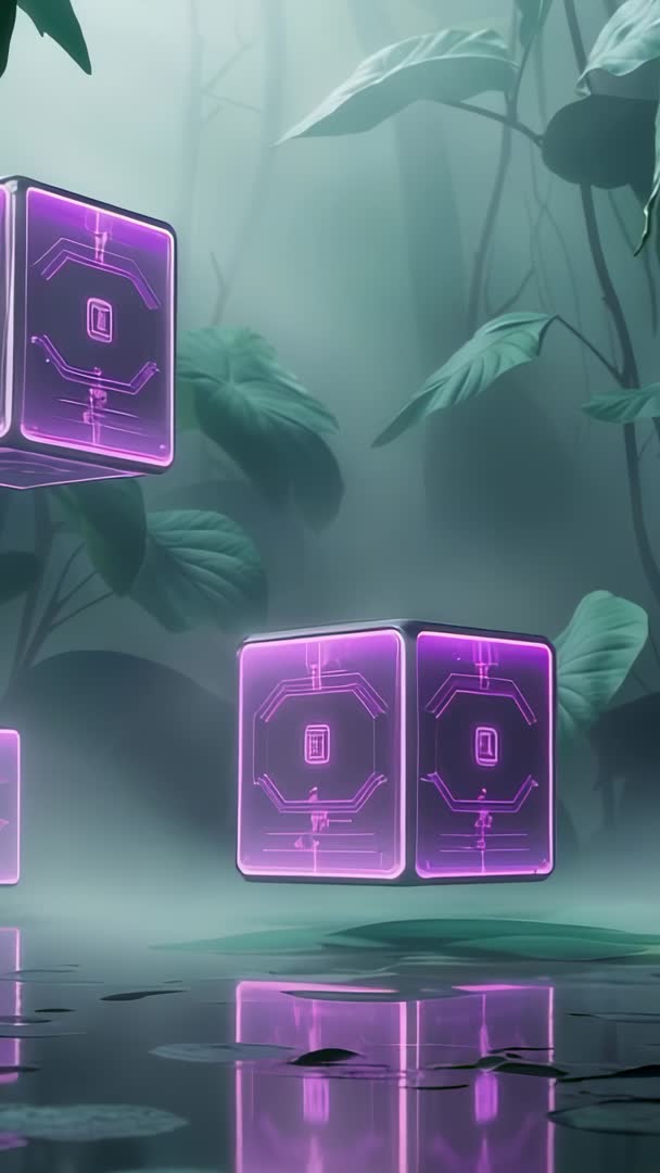 AI Generated Image. Materializing neon circuit cubes hovering above misty swamp pool with reflective water and scattered lily pads. Glowing purple circuits casting bioluminescent reflections and soft fog creating mystical atmosphere. Vertical 9:16 loop optimized for mobile screens and story formats. Useful for futuristic intros, music video backgrounds, tech product reveals, app splash screens, meditation or ambient playlists, streaming overlays, social media reels, and NFT promos. Pairing suggestions: ambient synth or downtempo tracks, soft light leaks, subtle particle motion. Color direction focusing on teal fog and magenta neon for high-contrast cinematic look. Licensing ideas: marketing for tech brands, sci-fi short films, AR/VR demos, concept design presentations. Export tips: keep loop seamless, include subtle camera parallax, provide versions with and without logo for flexible compositing.