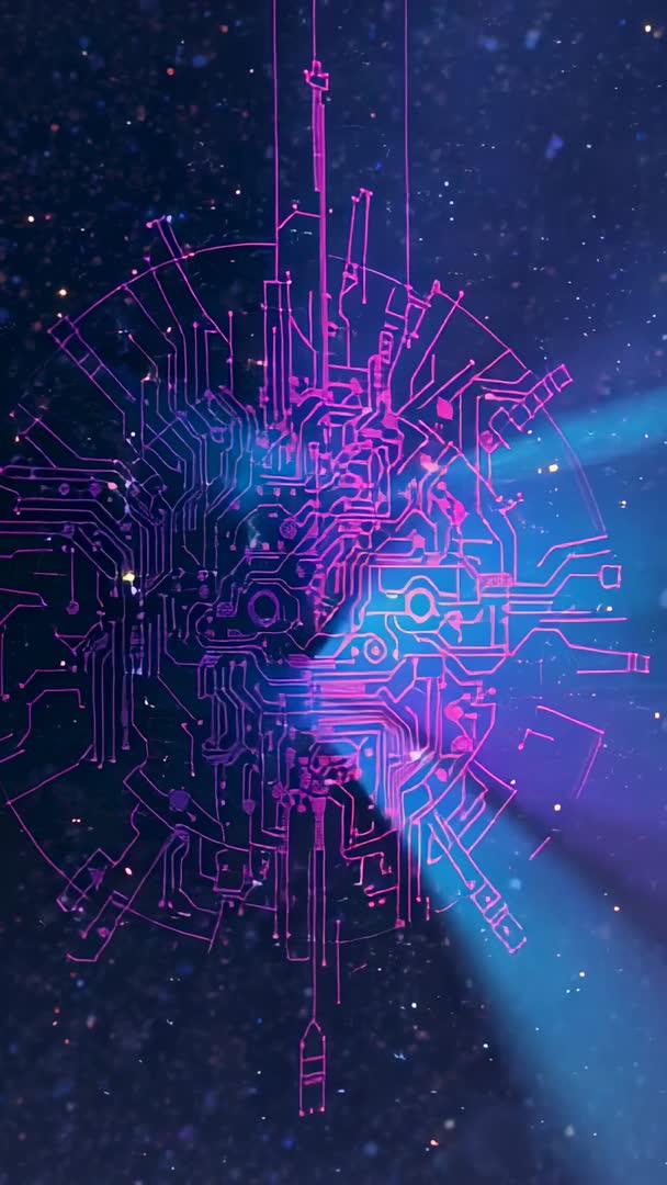 AI Generated Image. Showcasing neon circuit halo rotating inside cosmic nebula, pulsing holographic magenta rings and sweeping light beams revealing electronic nodes. Optimized for vertical video formats and loopable, suitable for mobile ads, social reels, VJ visuals, streaming intros and conference openers. Featuring magenta and deep space blue palette, allowing easy color grading and text overlay placement on left or right negative space. Ideal for technology campaigns, AI and data visualizations, sci-fi productions, futuristic UI demos, music and nightlife visuals. Suggested edits include extending loop duration, adding subtle film grain, boosting contrast for broadcast, and compositing with logo or lower third for branding.