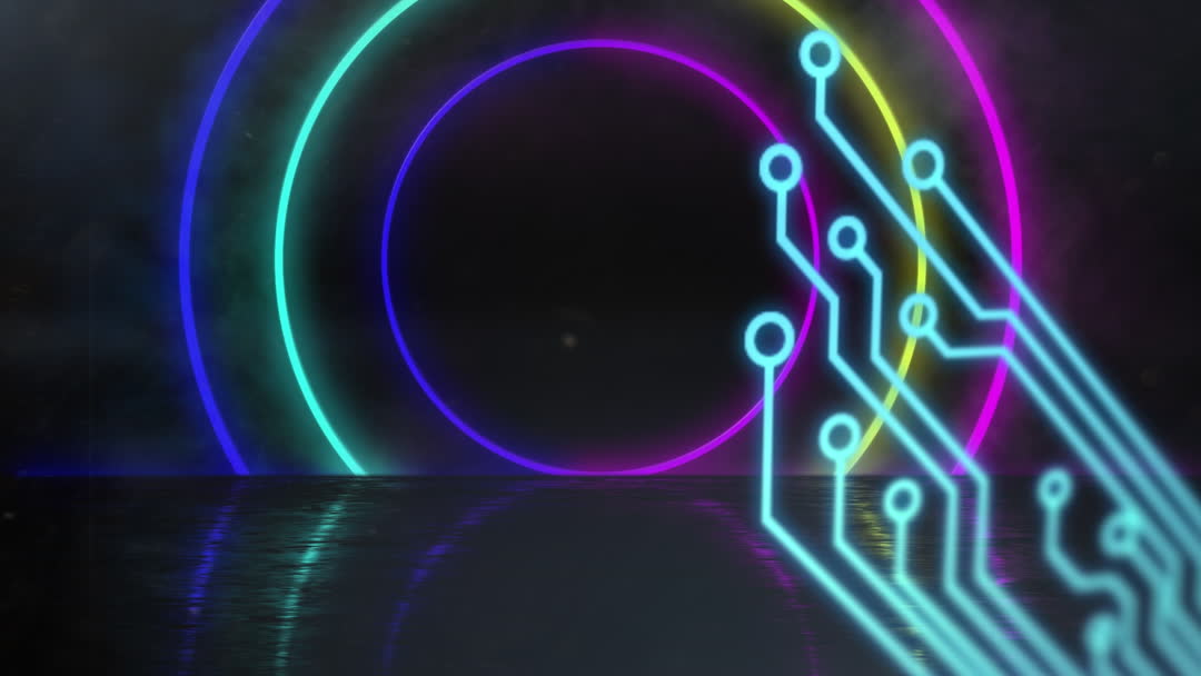 Captivating blend of neon circles and digital circuit patterns creating a futuristic and high-tech atmosphere. Perfect for themes related to cyber technology, virtual reality, or digital networks, this visual is suitable for use in video backgrounds, modern web design, and tech presentations.